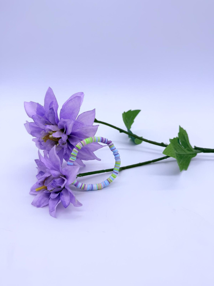 Trendy armband met platte kralen in zachte pastelkleuren. Comfortabel, elastisch en perfect om te combineren.