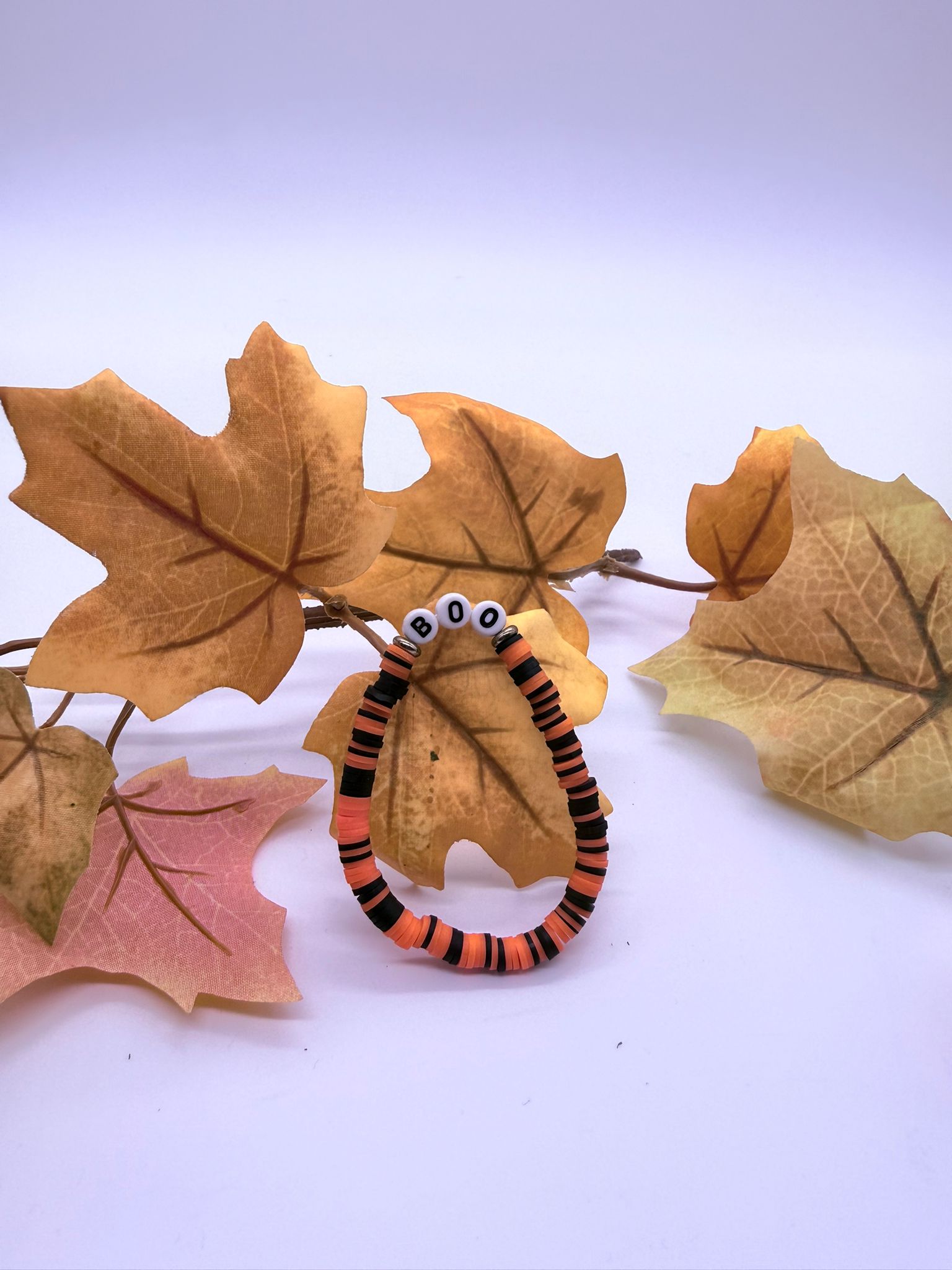 Dit leuke Halloween armband is perfect om je feestoutfit compleet te maken! Het bestaat uit zwart en oranje kraaltjes, met de letters 'BOO' voor een speelse en spookachtige uitstraling. Het is een ideale accessoire voor de herfst en Halloween.
