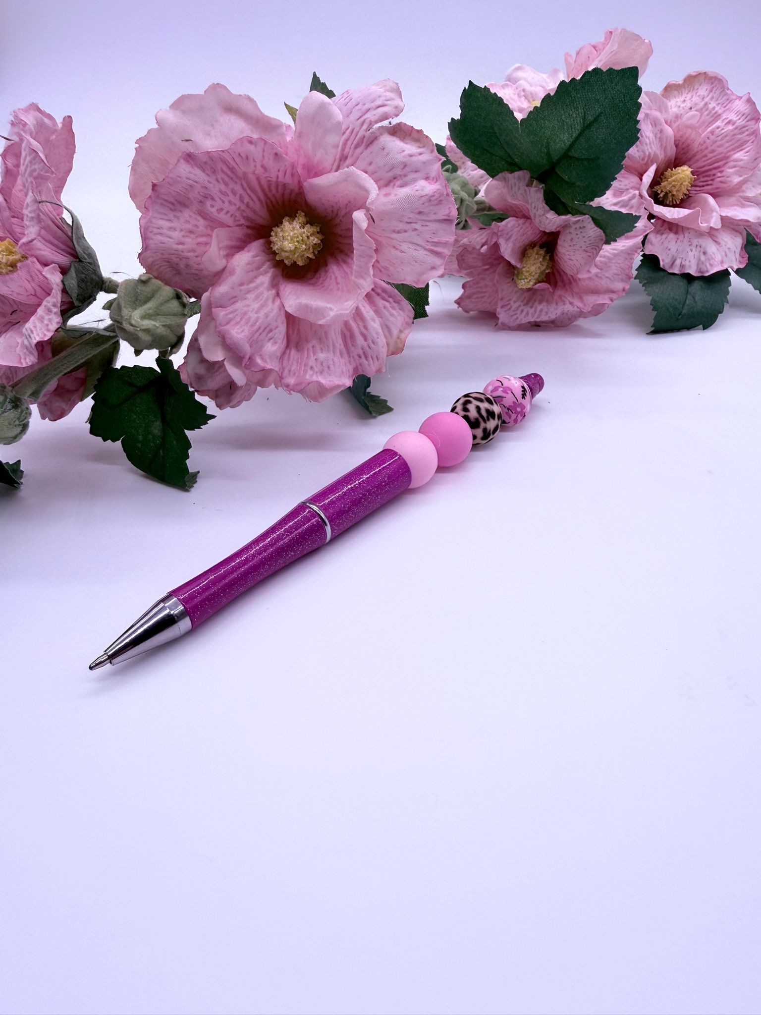 Een charmante pen met roze kralen, perfect voor wie van subtiele, vrouwelijke stijlen houdt.