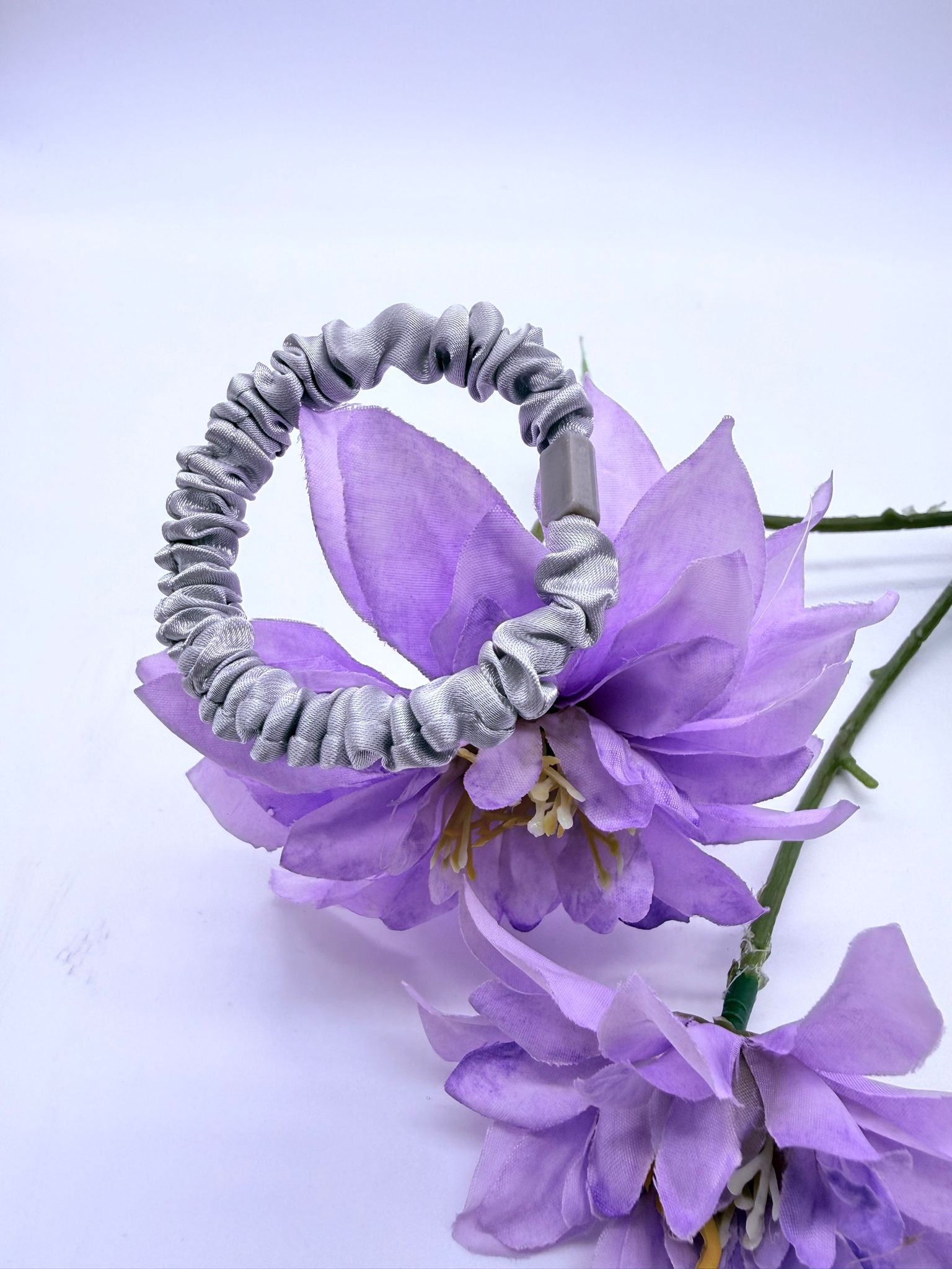 De Zilverlicht scrunchie brengt een vleugje glamour in je dagelijkse look. Met haar glanzende satijnen afwerking en zilvergrijze tint straalt ze tijdloze elegantie uit. De zachte stof beschermt je haar tegen breken en zorgt voor een comfortabele, stevige pasvorm. Perfect voor een chique avondlook of als subtiele eyecatcher overdag.